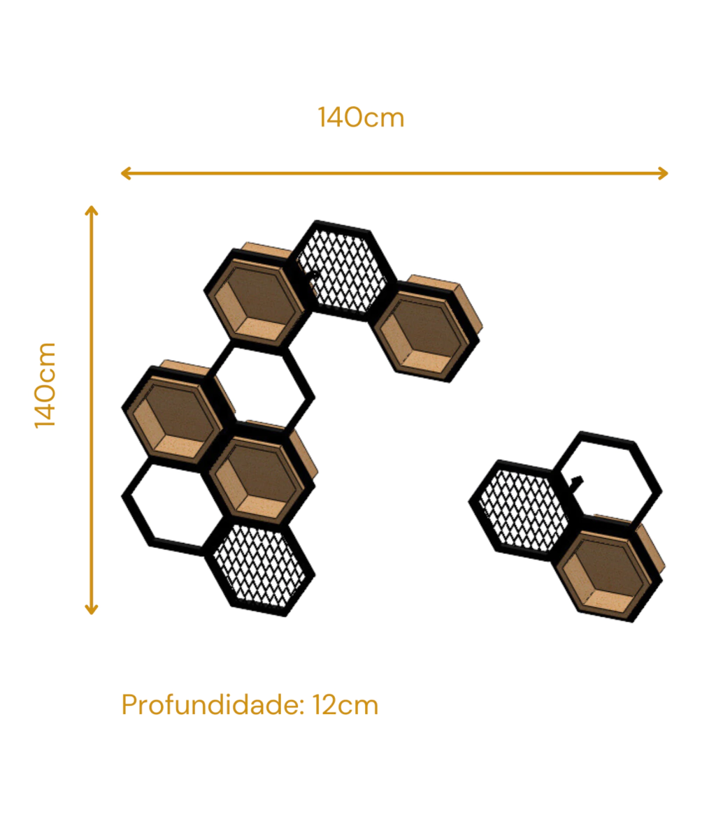 - Colméia de 11 hexágonos de aço, Estilo Industrial com medidas totais de 140x140x12cm (LxAxP), com 5 nichos em MDF.